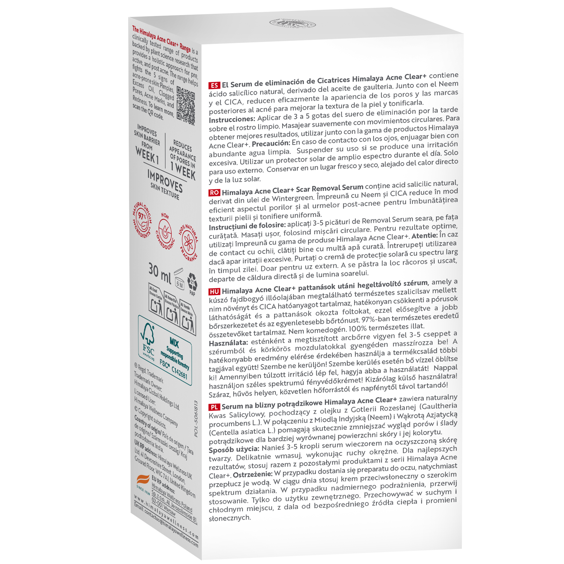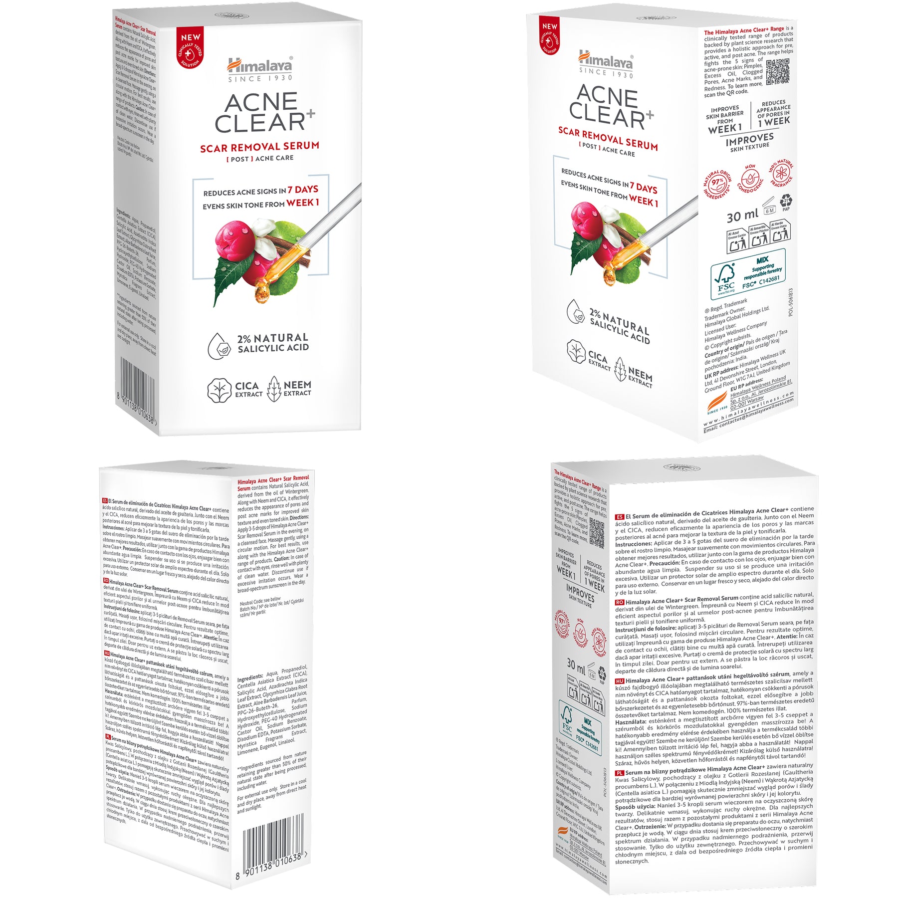 Verringern Sie das Erscheinungsbild von Aknenarben und verbessern Sie Ihre Hautstruktur mit Himalaya Acne Clear+ Scar Removal Serum – einem hochwirksamen, klinisch getesteten Serum mit natürlicher Salicylsäure, CICA (Centella Asiatica) und Neem-Extrakt. Die Formel reduziert sichtbar Aknenarben, glättet Unebenheiten und stärkt die Hautbarriere innerhalb von 7 Tagen. Sie verfeinert die Poren, beruhigt Rötungen und fördert einen gleichmäßigeren, strahlenden Teint. Bei kontinuierlicher Anwendung erscheint Ihre Haut kräftiger und Unreinheiten werden sichtbar gemildert. Klinisch erwiesen bekämpft es fünf Anzeichen von Akne – überschüssigen Talg, Pickel, Rötungen, verstopfte Poren und Aknenarben – und bewahrt gleichzeitig ein sanftes, natürliches Gleichgewicht.